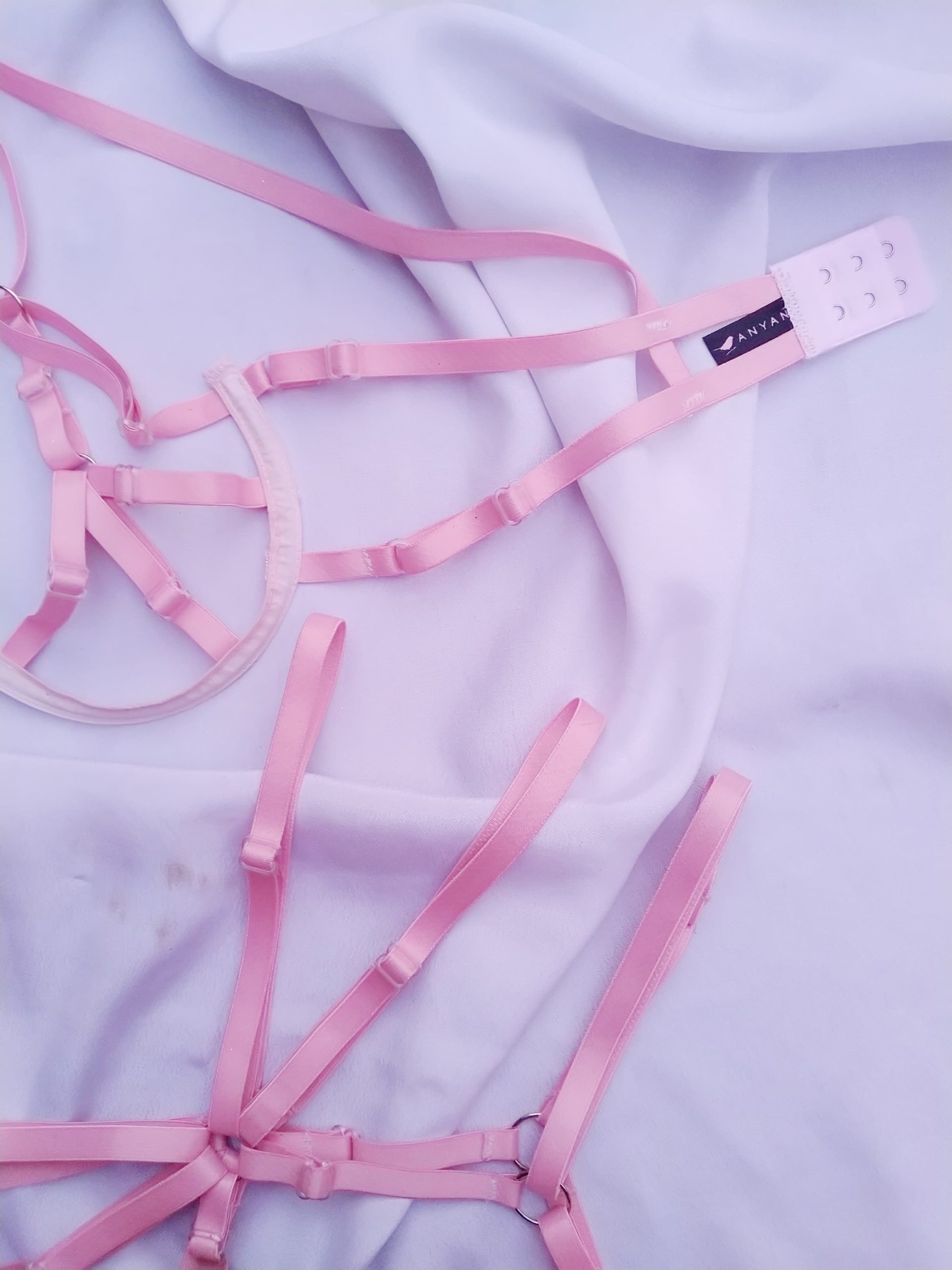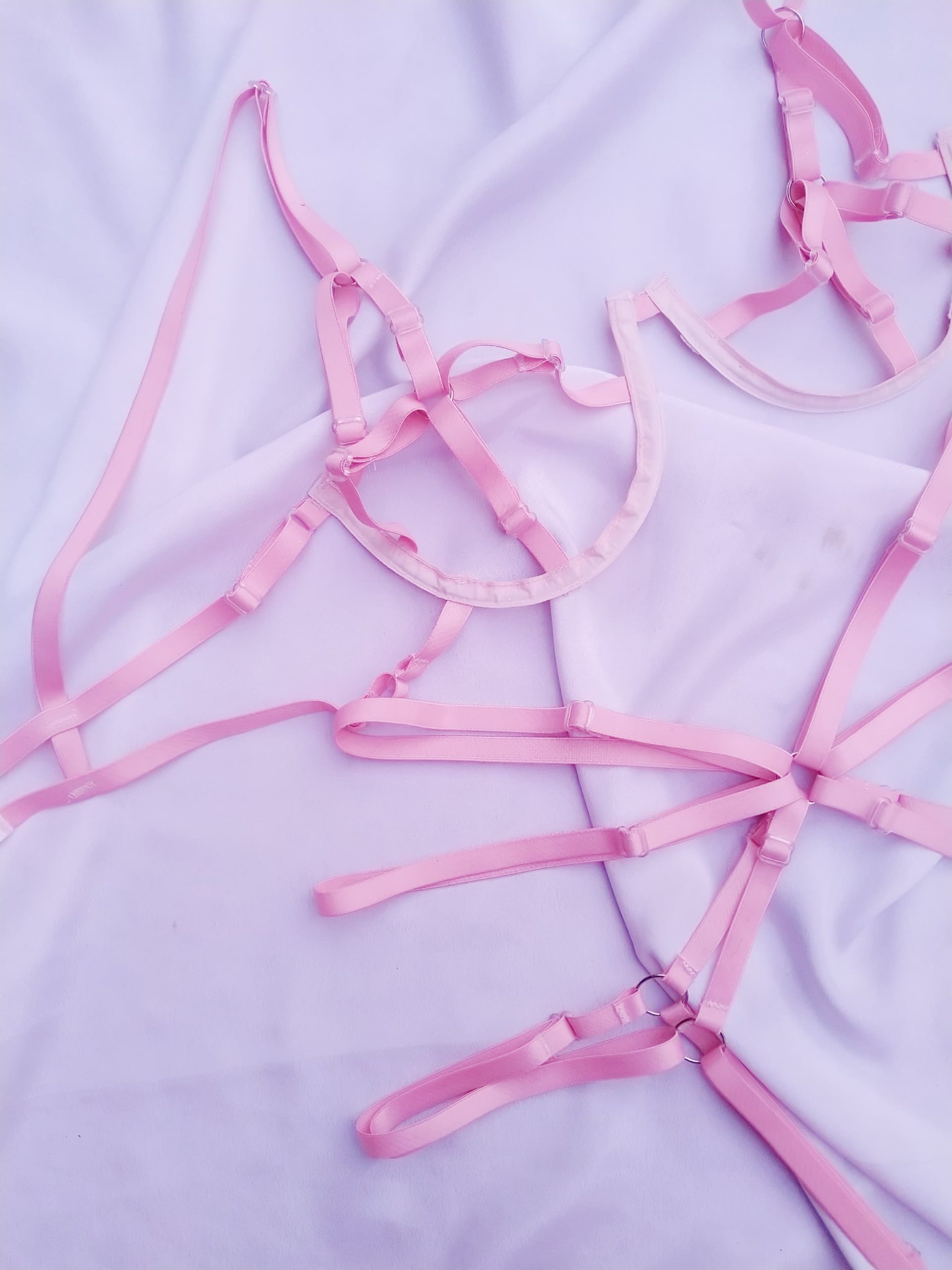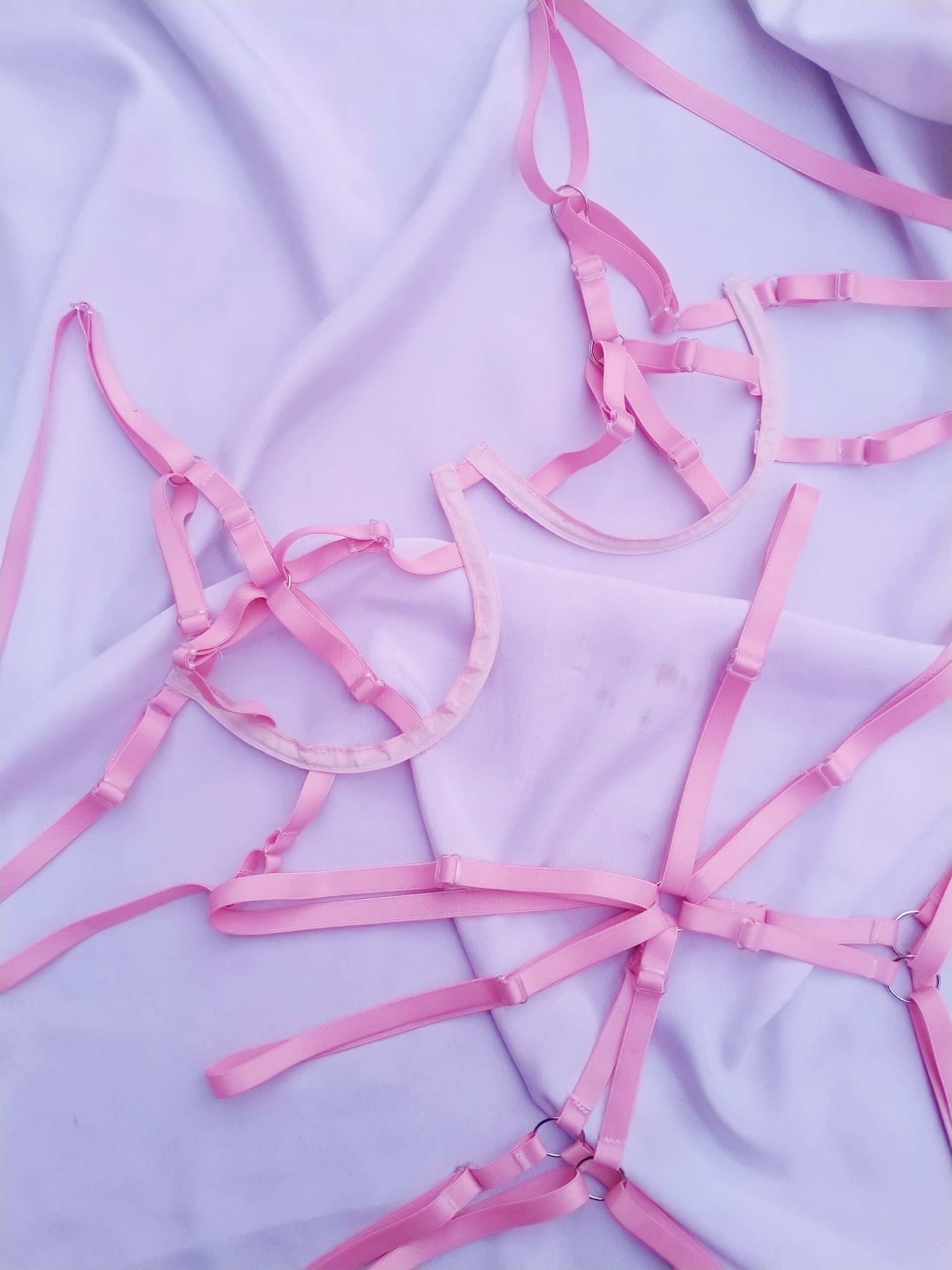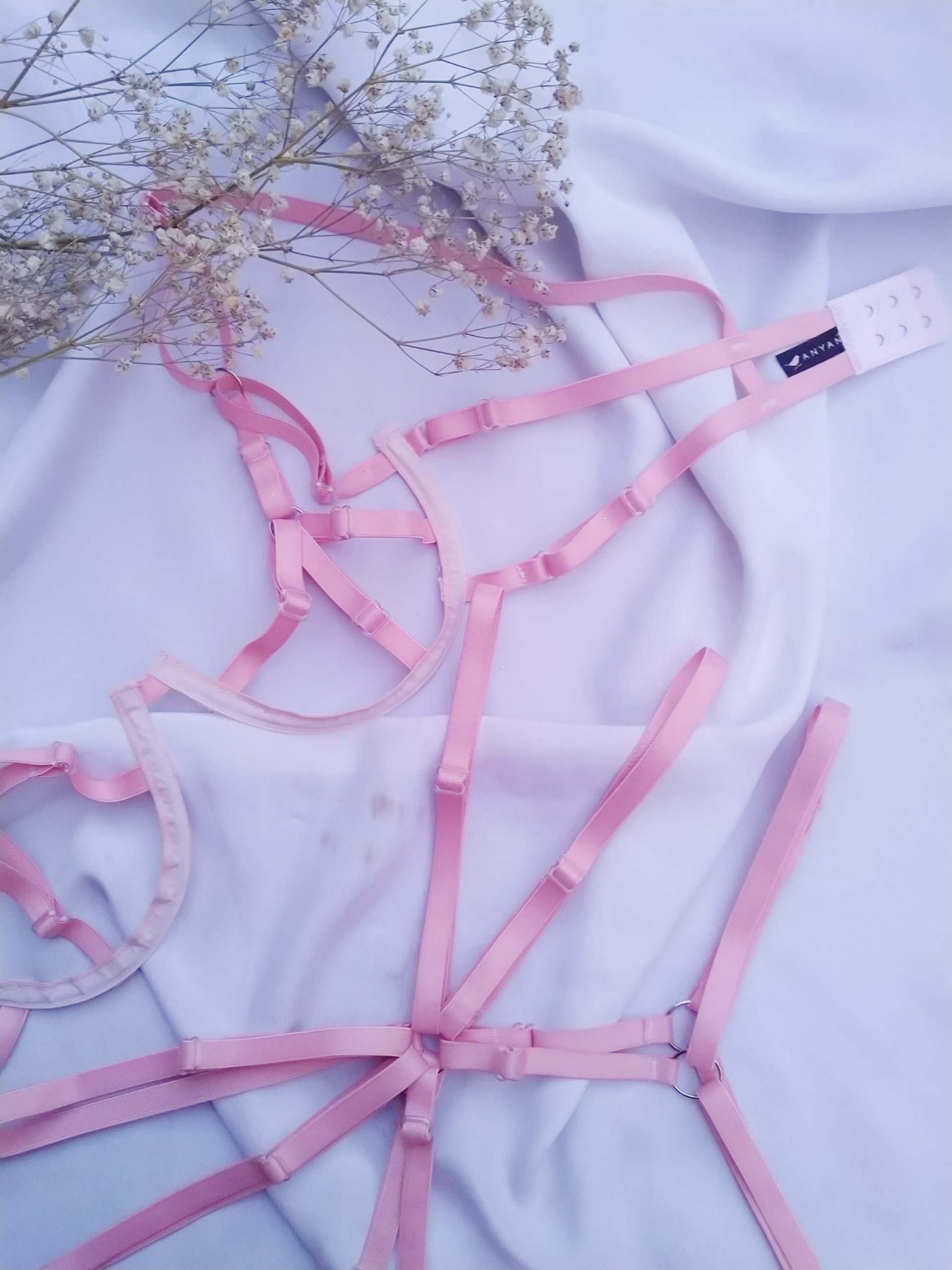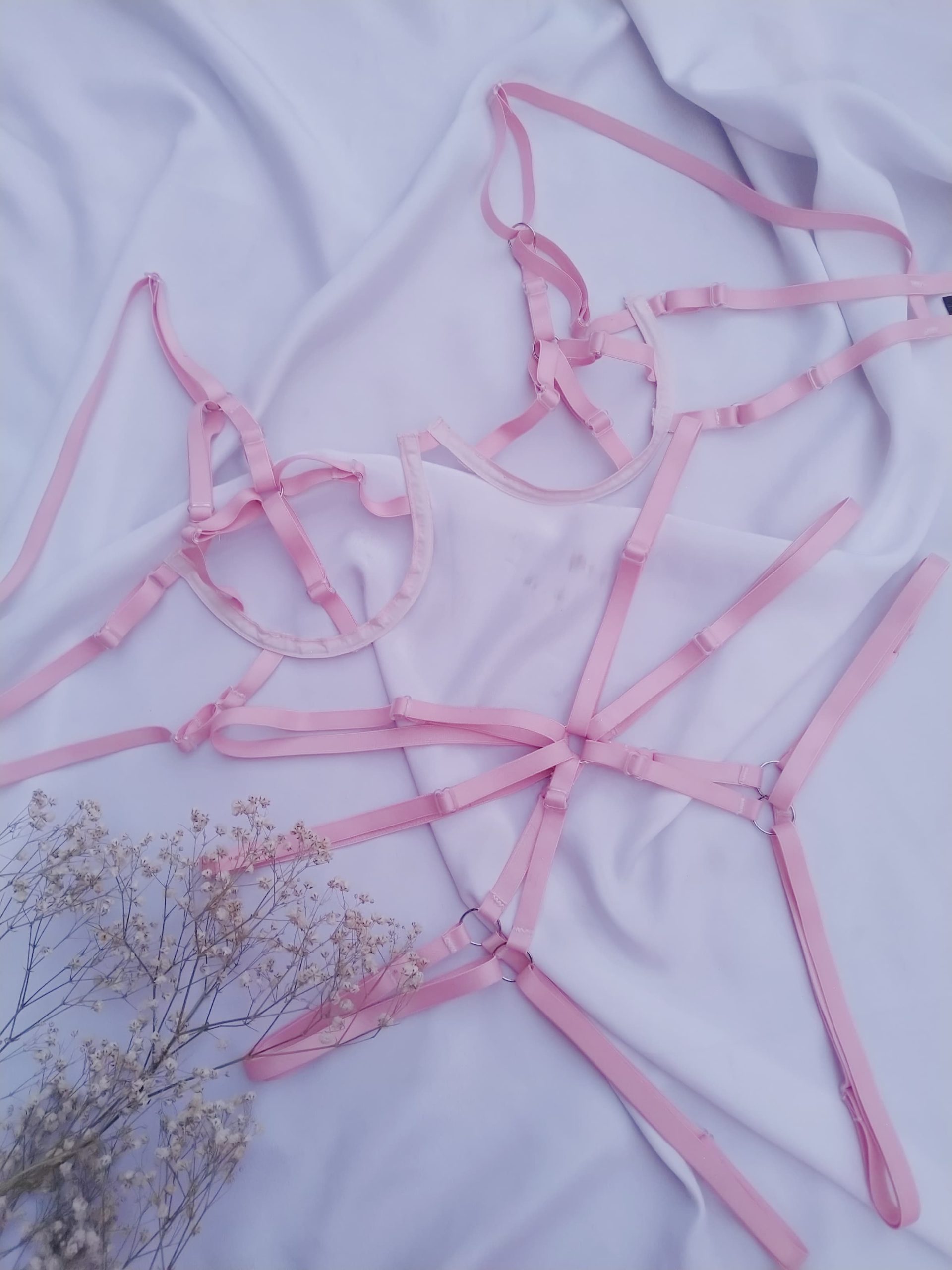 Arnés confeccionado en bandas elásticas de lencería, las cuales se ajustan a tu cuerpo. El bra tiene barbas y puedes ajustar el tamaño de la copa y la espalda. El calzón arnés también se ajusta por completo. Puedes elegir entre diferentes colores.