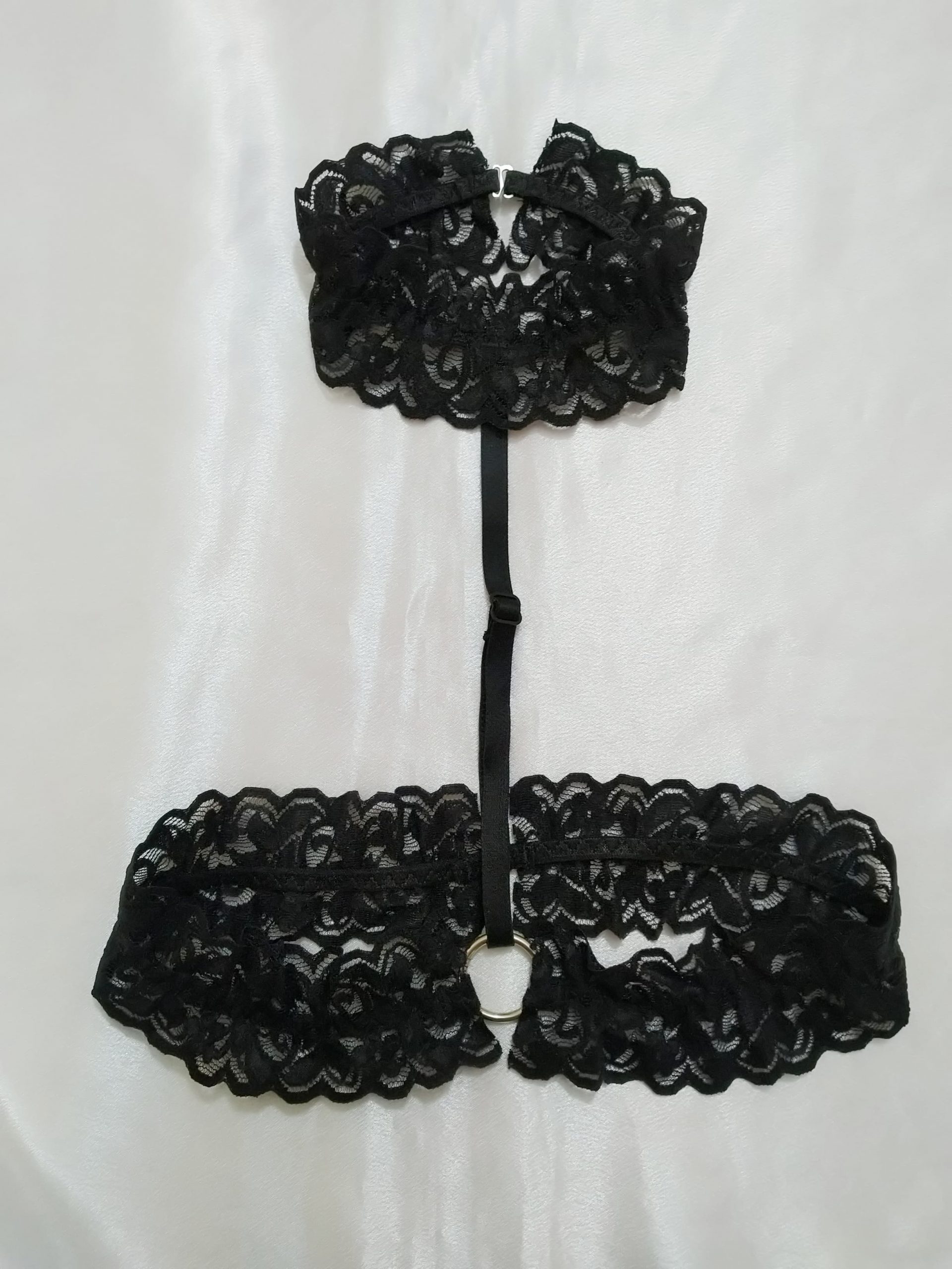 Arnés confeccionado en encaje y tirante de pecho ajustable. Para elegir talla debes saber tu contorno de cintura.