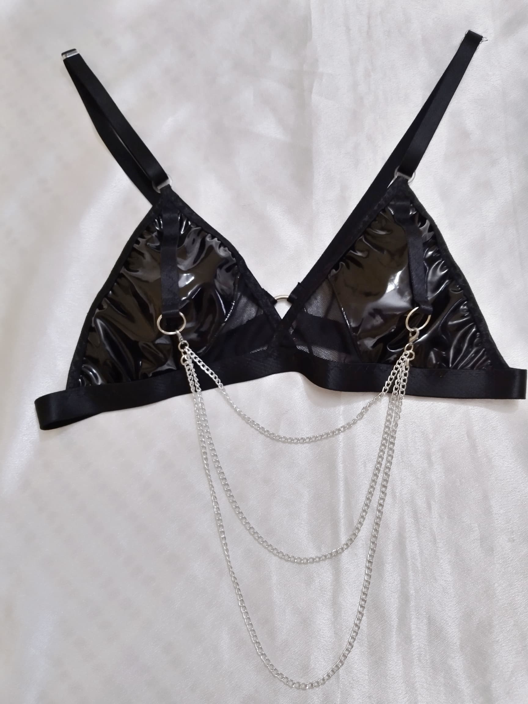 Bralette confeccionado en charol elasticado negro y malla elasticada negra. Bra triángulo con abertura translucida en escote, argollas metálicas en la zona de pezones donde puedes colgar adornos o accesorios (en la foto un accesorio de trío de cadenas), argolla de cierre en espalda. Las cadenas y argollas son niqueladas, todos los tirantes son ajustables, incluye el accesorio de cadenas.