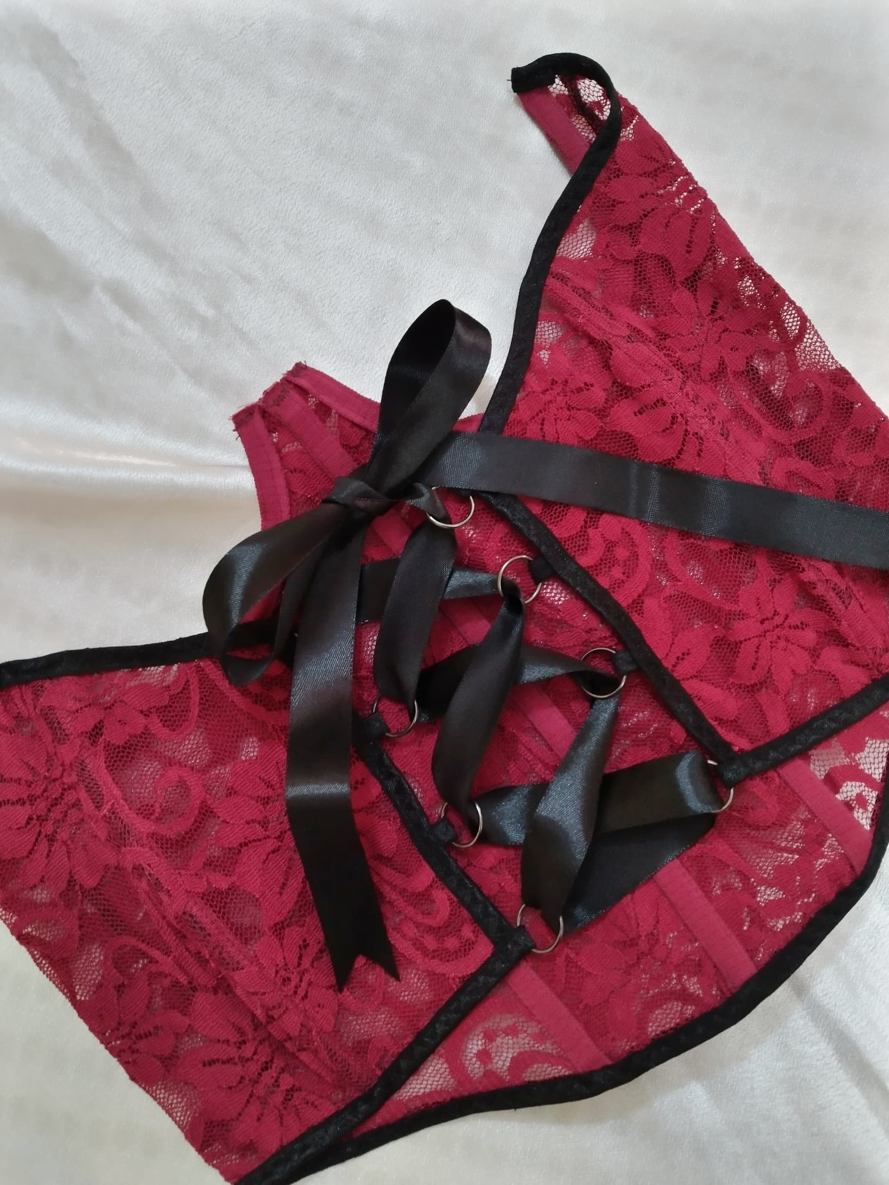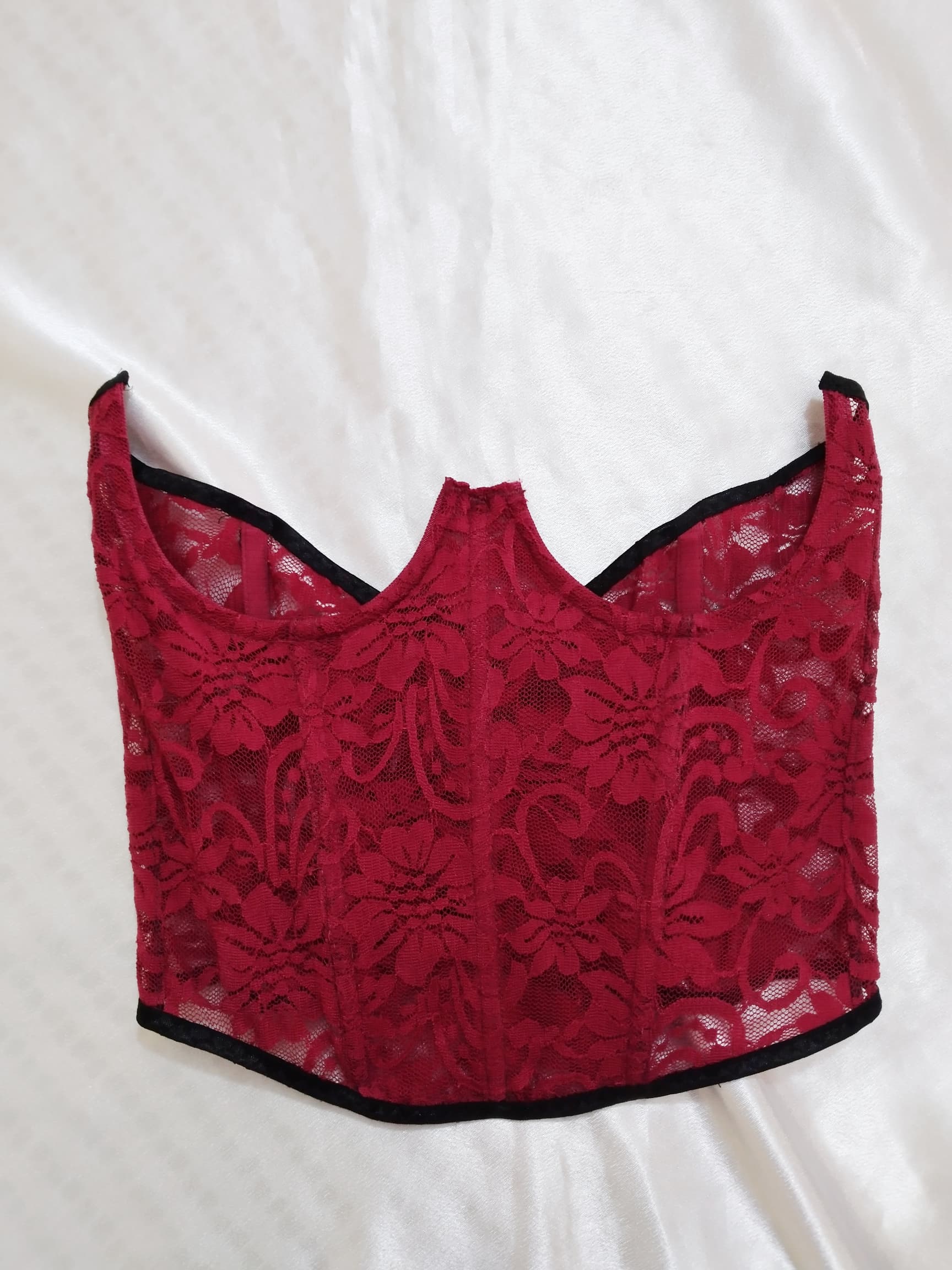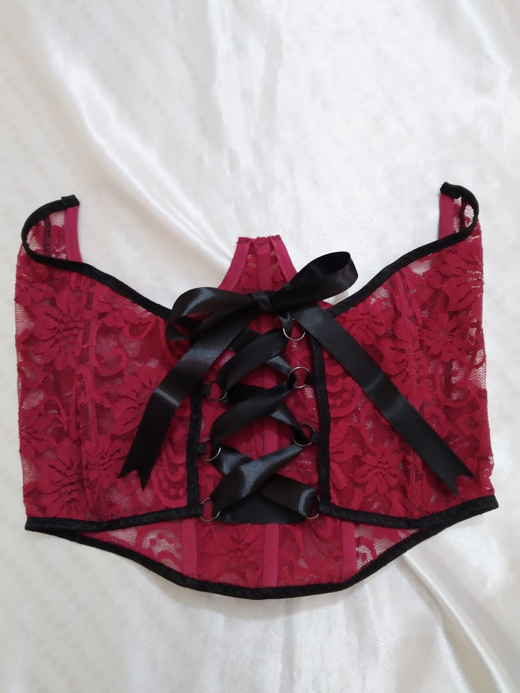 Bustier confeccionado en encaje (puedes elegir color: burdeo, negro, blanco o rojo), sin copas, armado con barbas y ballenas verticales. Cierre que se ajusta con cintas. Tiene argollas metálicas.