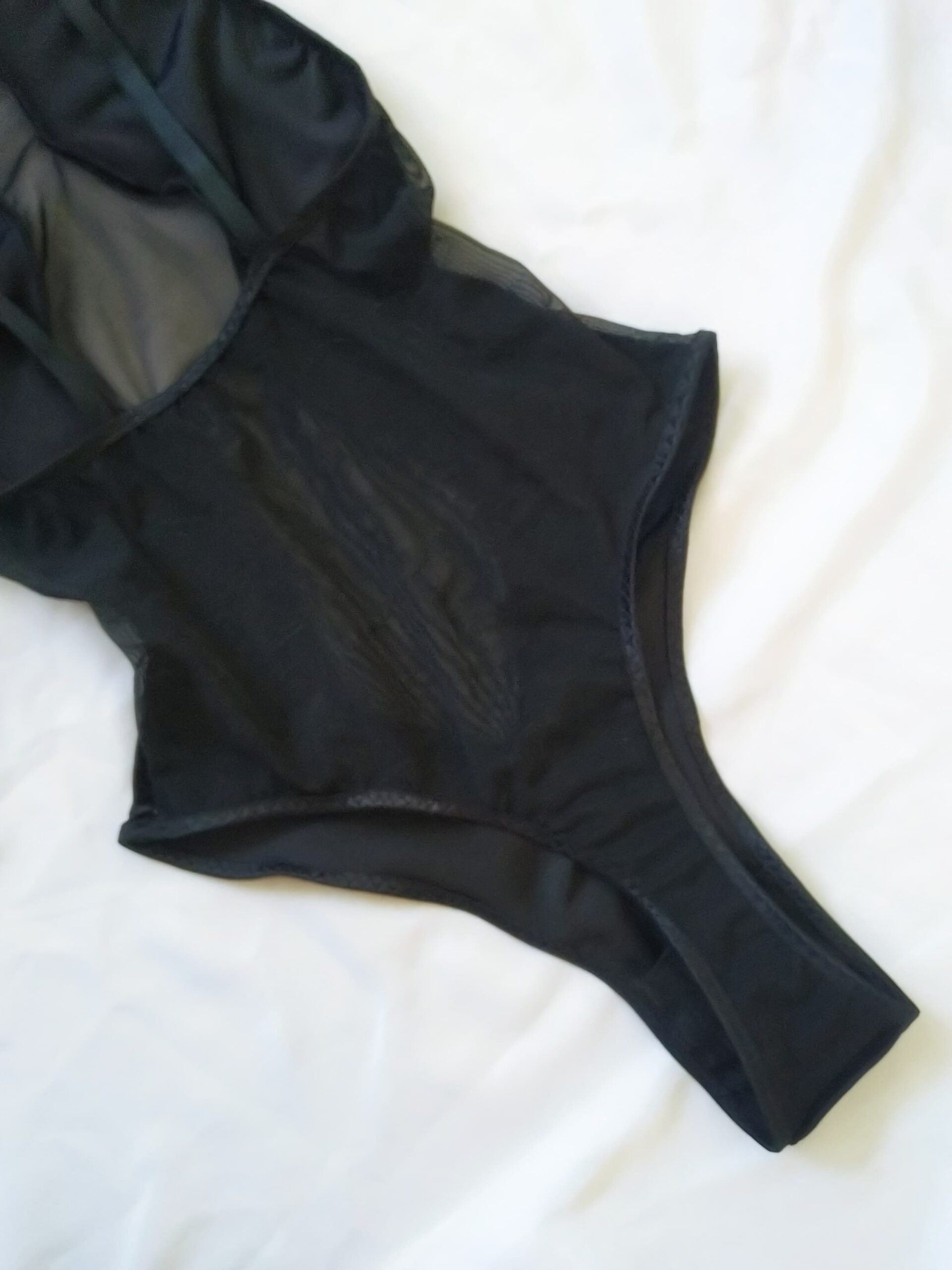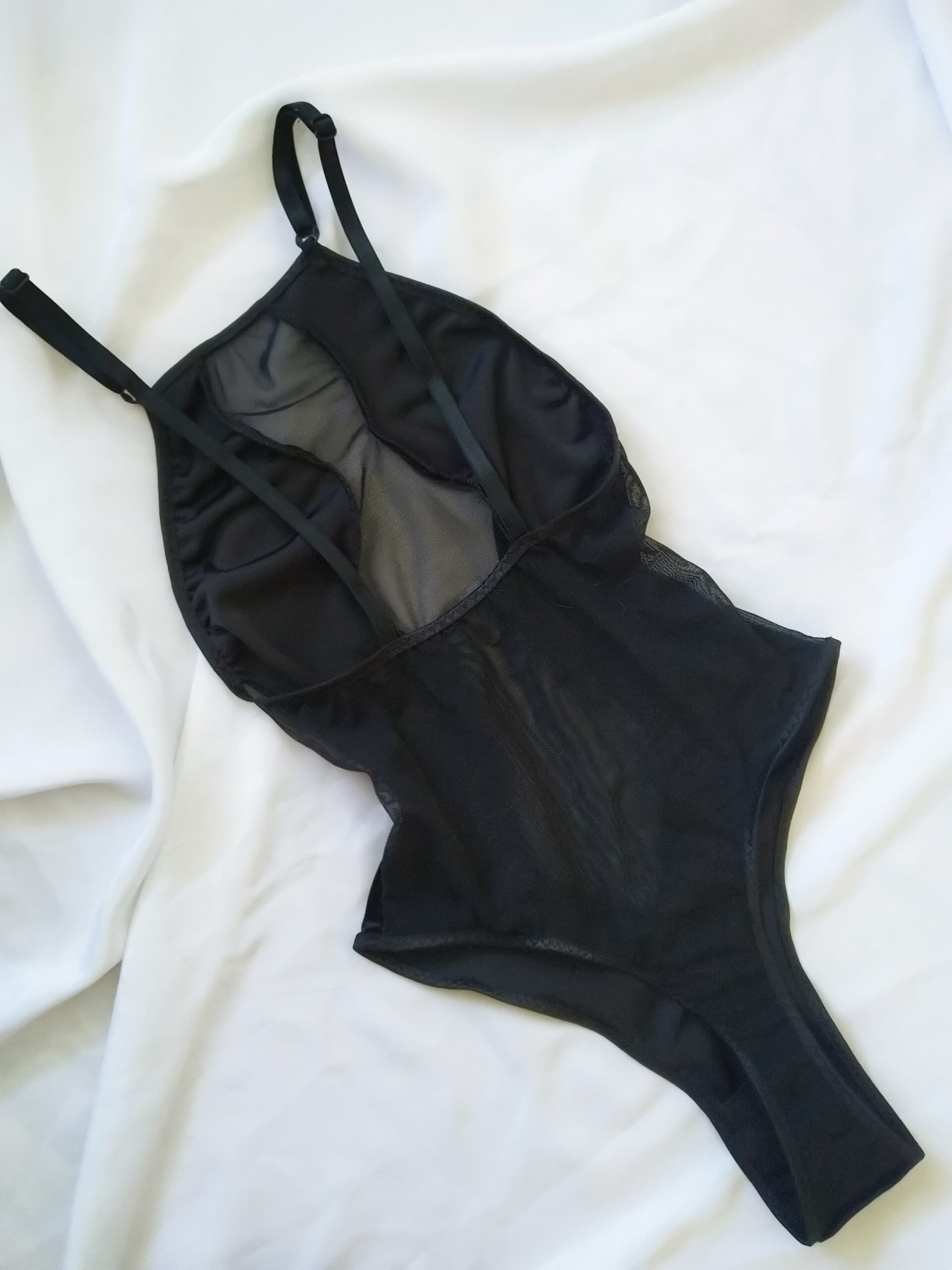 Bodysuit confeccionado en terciopelo negro elasticado y malla elasticada negra, delantero con transparencia en zona de escote con forma de olas. Rebaje ochentero y colales en zona trasera, los tirantes son ajustables.