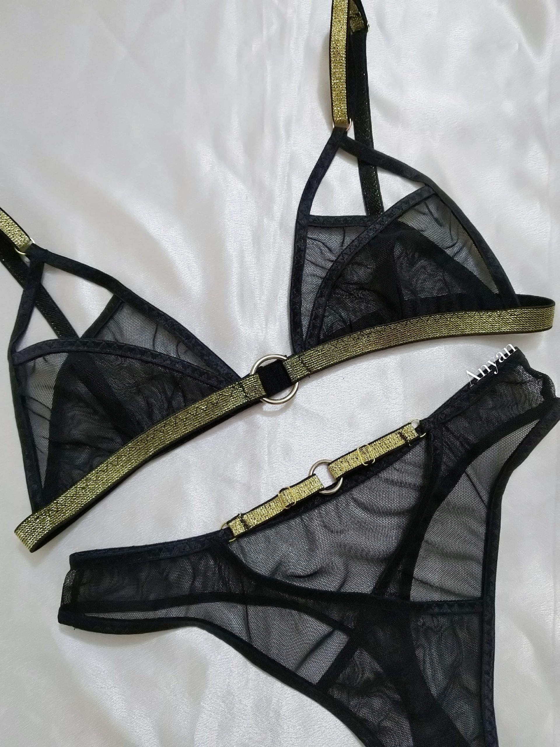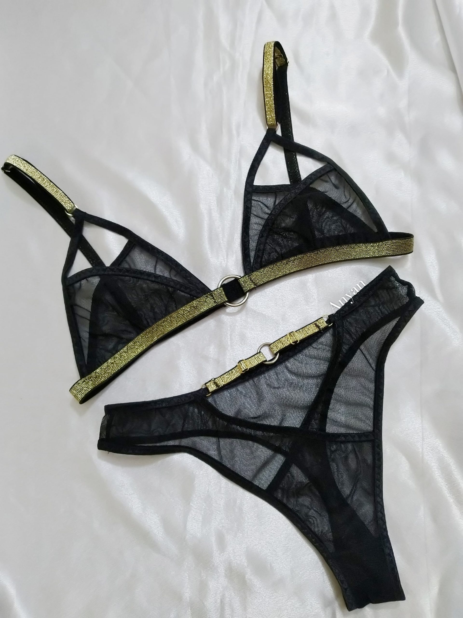 Conjunto confeccionado en malla elasticada negra y elásticos dorados. Bra triángulo con cortes que se superponen, colales tiro medio con delantero abierto en V con cortes que se superponen. El accesorio de cadenas doradas no viene incluido, se agrega solo si lo compras al seleccionar si en el menú de selección de producto