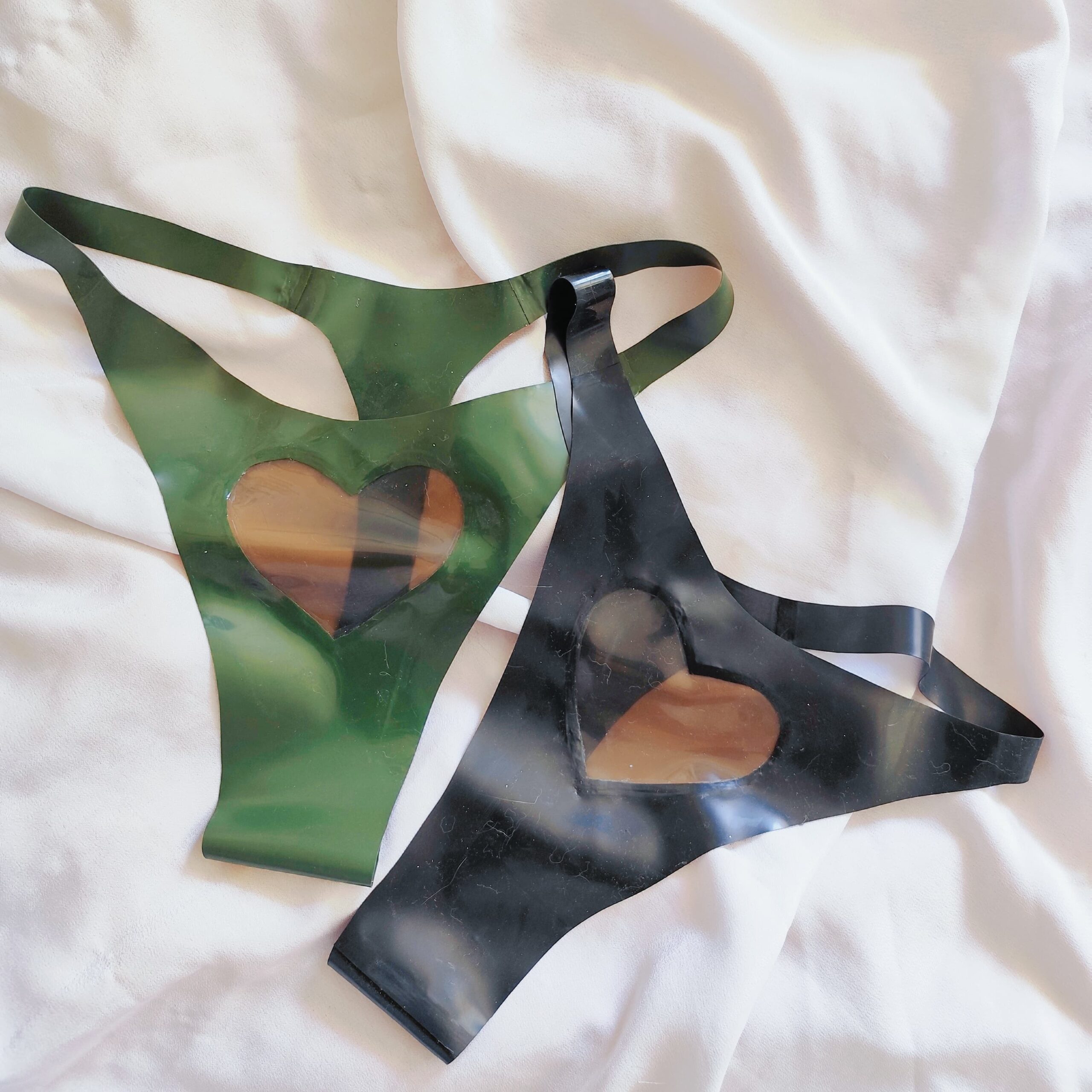 Tanga colales confeccionado en latex natural con transparencia de corazón en el delantero. Puedes elegir entre más colores por tallas o a tu medida